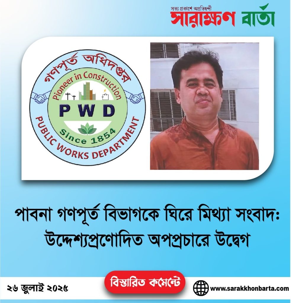 সম্প্রতি পাবনা গণপূর্ত অধিদপ্তর ও এর তত্ত্বাবধায়ক প্রকৌশলীকে ঘিরে সামাজিক যোগাযোগ মাধ্যম এবং কিছু গণমাধ্যমে প্রকাশিত একটি ভিত্তিহীন ও বানোয়াট সংবাদ নিয়ে জেলাজুড়ে সৃষ্টি হয়েছে মিশ্র প্রতিক্রিয়া ও তোলপাড়। সংবাদটিতে দাবি করা হয়েছে, অধিদপ্তরের একটি মেরামত প্রকল্প মৌখিকভাবে কোন এক ঠিকাদারকে প্রদান করা হয়েছে, যা প্রকৃতপক্ষে সম্পূর্ণ মিথ্যা ও ভিত্তিহীন বলে জানা গেছে।