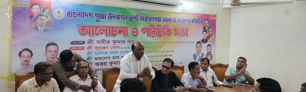 আজ শনিবার ২৬ জুলাই,২০২৫ বিকাল সাড়ে চারটায় নারায়ণগঞ্জ জেলা শিল্পকলা একাডেমী সেমিনার কক্ষে বাংলাদেশ পূজা উদযাপন ফ্রন্ট নারায়ণগঞ্জ জেলা ও মহানগর কমিটির আলোচনা ও পরিচিত সভা অনুষ্ঠিত হয়।