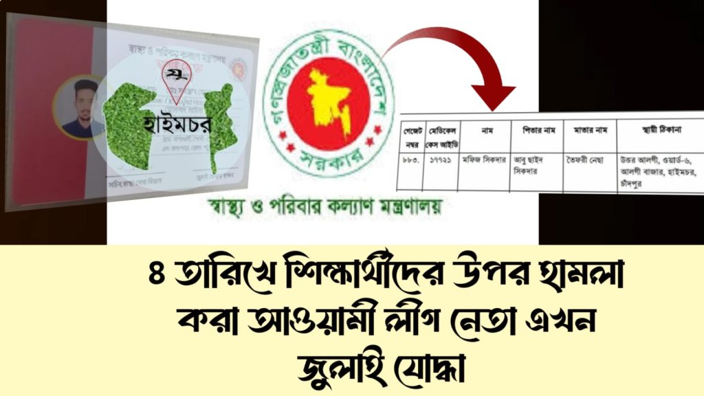 চাঁদপুর জেলার হাইমচর উপজেলায় জুলাই -আগস্ট ২০২৪ এর গণঅভ্যুত্থান’-এর আহত কার্ড সংগ্রহ করতে এসে এক আওয়ামী লীগ কর্মী জনরোষের মুখে পড়েছেন। এলাকাবাসী ও ছাত্র জনতার দাবি,তিনি ৪ তারিখে হাইমচর উপজেলা ছাত্র জনতার আন্দোলনে শিক্ষার্থীদের উপরে হামলায় অংশ নেন।এবং আন্দোলনের দিন (৫ আগস্ট) হাইমচর উপজেলা আওয়ামী লীগ সাধারণ সম্পাদক নুর হোসেন পাটোয়ারীর বাড়িতে গণধোলাইয়ের শিকার হয়ে পরবর্তীতে ঢাকার একটি হাসপাতালে চিকিৎসা নেন।