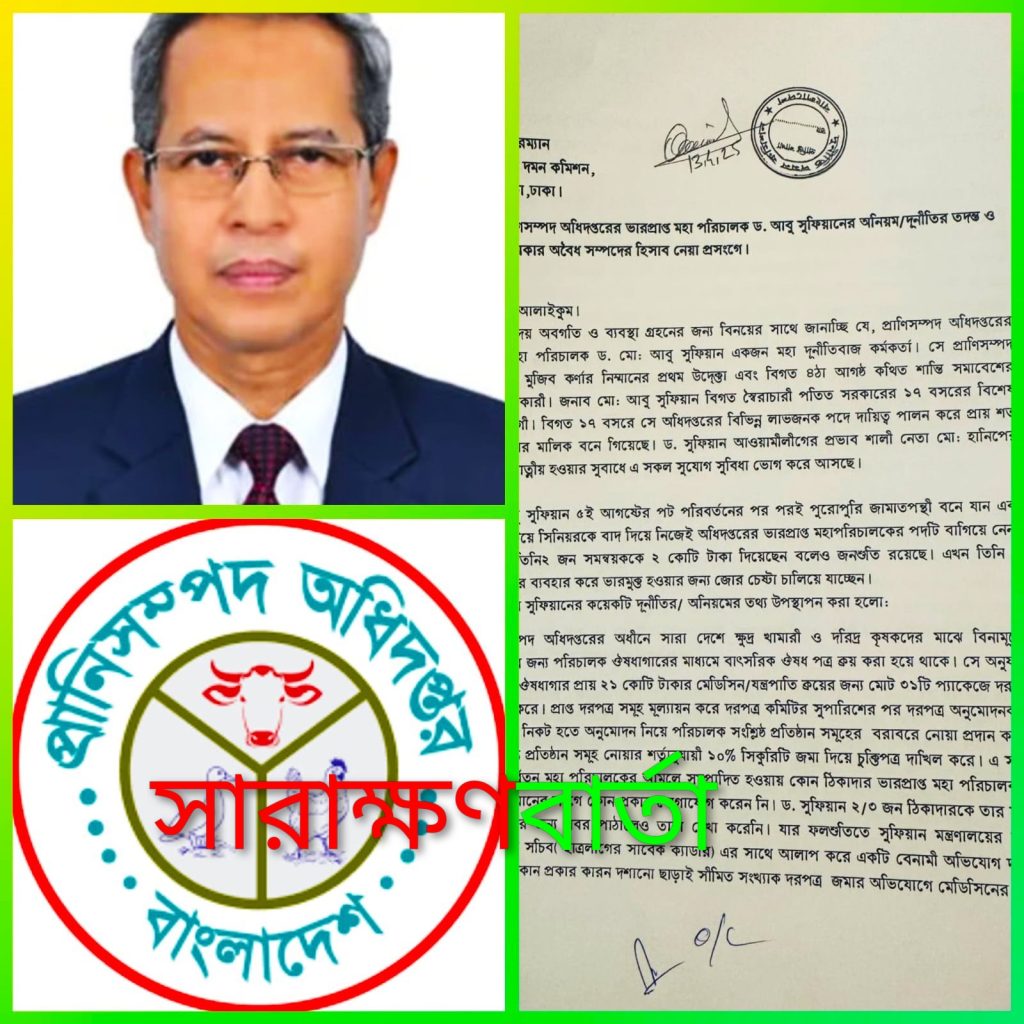 প্রাণিসম্পদ অধিদপ্তরে চলছে মহালুটপাট !  ভারপ্রাপ্ত মহাপরিচালক ড.আবু সুফিয়ানের বিরুদ্ধে দুদকে অন্তহীন দুর্নীতির অভিযোগ!