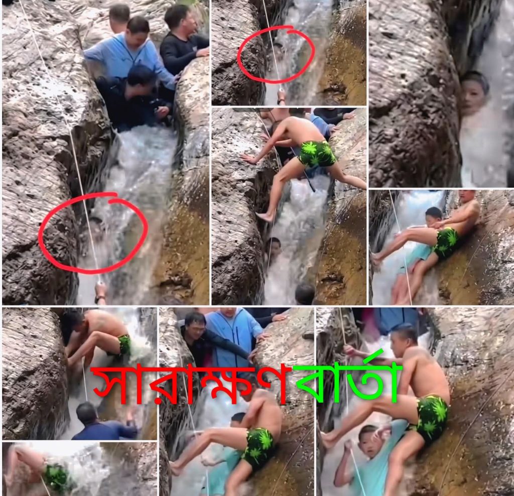 কয়েকজন সাহসী মানুষ নিজেদের জীবনের ঝুঁকি নিয়ে একে অপরের হাত ধরে শক্ত করে দাঁড়িয়ে গেলেন পানির স্রোতের সামনে। তারা শরীর দিয়ে তৈরি করলেন এক “মানবিক দেয়াল”, যাতে ঝর্ণার ভয়ংকর স্রোত কিছুটা বাধা পায় এবং শিশুটি ভেসে না যায়। একদিকে তীব্র স্রোতের চাপ, অন্যদিকে পাথরের খাঁজে আটকে থাকা শিশুটির কান্না ,সব মিলিয়ে এক রুদ্ধশ্বাস পরিস্থিতি!