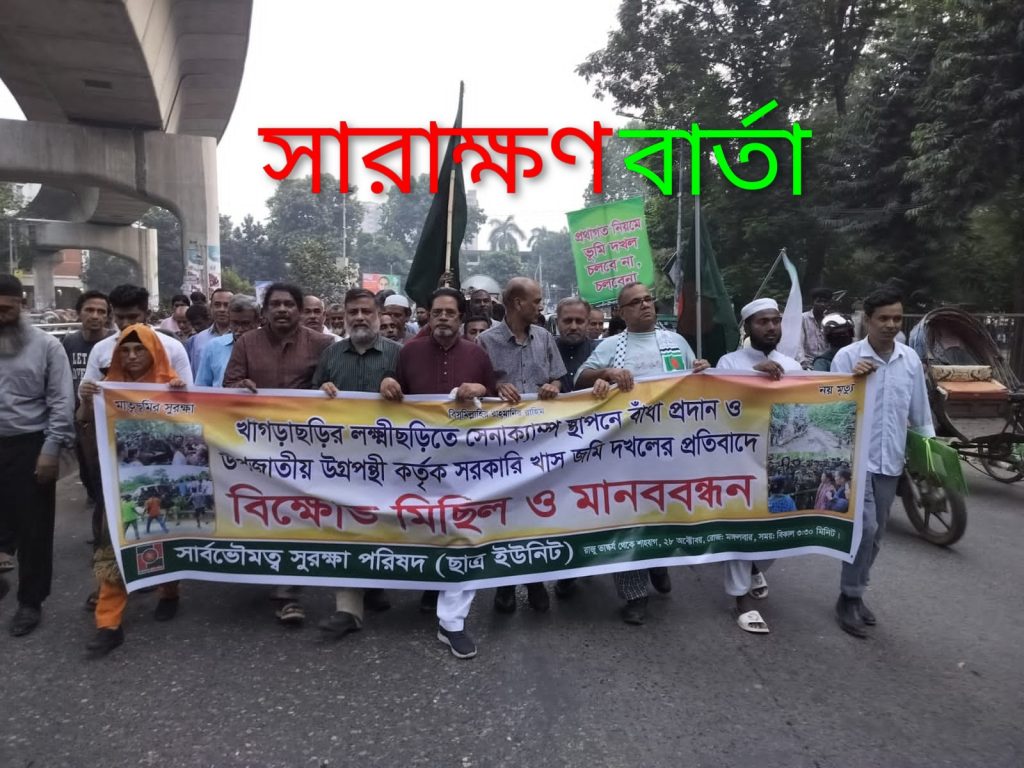 খাগড়াছড়ির লক্ষ্মীছড়িতে সেনা ক্যাম্প স্থাপনে বাধা প্রদান ও উপজাতীয় উগ্রপন্থী কর্তৃক সরকারি খাস জমি দখলের প্রতিবাদে আজ ২৮ অক্টোবর (২০২৫) মঙ্গলবার বিকালে ঢাকা বিশ্ববিদ্যালয়ের রাজু ভাস্কর্যের পাদদেশে মানববন্ধন করেছে সার্বভৌমত্ব সুরক্ষা পরিষদ এর স্টুডেন্টস ইউনিটের নেতা-কর্মীরা ।মানববন্ধন শেষে বিক্ষোভ মিছিল করেছে শতাধিক ছাত্র- জনতা ।