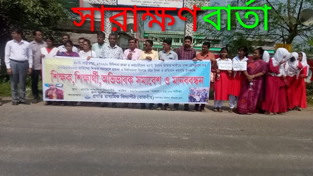 খুলনা বটিয়াঘাটা প্রগতি মাধ্যমিক বিদ্যাপীঠে শিক্ষক, শিক্ষার্থী , অভিভাবক সমাবেশ ও মানববন্ধন অনুষ্ঠিত হয়। গতকাল ১৬ অক্টোবর ২০% বাড়ি ভাড়া, ১৫০০ টাকা চিকিৎসা ভাতা ও কর্মচারীদের ৭৫ % উৎসব ভাতার দাবিতে ঢাকা প্রেসক্লাবের গত ১২-১০- ২০২৫ তারিখের শিক্ষক সমাবেশে হামলা ও নির্যাতনের বিরুদ্ধে তীব্র নিন্দা ও প্রতিবাদ কর্মসূচি উপলক্ষে শিক্ষক, শিক্ষার্থী , অভিভাবক সমাবেশ ও মানববন্ধন করেন বিদ্যালয়টির শিক্ষক শিক্ষার্থী ও অভিভাবকবৃন্দ।