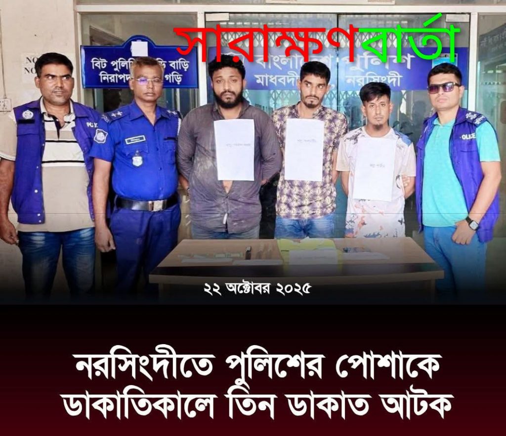 নরসিংদীর মাধবদীতে পুলিশ এর পোশাক পরে ডাকাতির সময় তিন ডাকাত গ্রেফতার ।