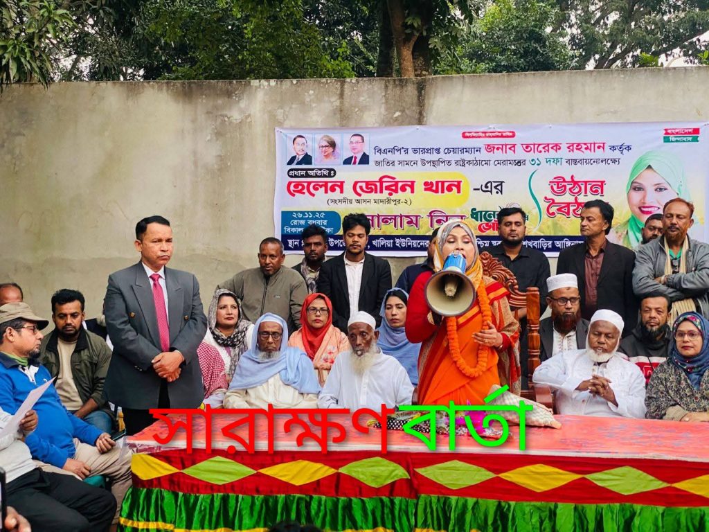 আজ ২৬ নভেম্বর ২০২৫ বুধবার বিকালে মাদারীপুরের রাজৈর উপজেলার পশ্চিম স্বরমঙ্গল গ্রামে শেখ বাড়িতে আগামীর রাষ্ট্রনায়ক জনাব তারেক রহমানের ৩১ দফা বাস্তবায়নে আয়োজিত এক উঠান বৈঠকে প্রধান অতিথি হিসেবে উপস্থিত ছিলেন মাদারীপুর – ২ সংসদীয় আসনে মনোনয়ন প্রার্থী বিএনপির কেন্দ্রীয় নির্বাহী কমিটির সহ শিক্ষা বিষয়ক সম্পাদক ও কেন্দ্রীয় মহিলা দলের সিনিয়র যুগ্ম সাধারণ সম্পাদক হেলেন জেরিন খান। অনুষ্ঠানে সভাপতিত্ব করেন রহম বেপারী। রাজৈর উপজেলা বিএনপির সাবেক সহ-সভাপতি এডভোকেট গৌরাঙ্গ বসুর সঞ্চালনায় অনুষ্ঠানে বিশেষ অতিথি হিসেবে উপস্থিত ছিলেন মাদারীপুর জেলা বিএনপির সংগ্রামী সিনিয়র যুগ্ম আহ্বায়ক সোহরাব হোসেন হাওলাদার, সাবেক যুবদলের সভাপতি ও জেলা বিএনপির সদস্য মুজিবর রহমান হাওলাদার, কেন্দ্রীয় মহিলা দলের এক ঝাঁক নারী নেতৃত্ব। রাজৈর পৌর বিএনপির আহ্বায়ক শেখ জাকির হোসেন এর সার্বিক তত্ত্বাবধানে অনুষ্ঠানে উপস্থিত ছিলেন রাজৈর উপজেলা বিএনপির বিভিন্ন স্তরের নেতৃবৃন্দ। আরো উপস্থিত ছিলেন বিএনপি নেতা সিরাজ ফকির, চুন্নু মাতুব্বর ,যুব নেতা লিটু খান,যুব নেতা শেখ মহিউদ্দিন মহি,পান্নু শেখ,রাজৈর উপজেলা মৎস্যজীবী দলের সংগ্রামী সভাপতি রাজু আহমেদ বাবুল, বিএনপি নেতা মাসুদ ফকির, যুব নেতা মিরাজ ফকির,বাশার শেখ,হিরু মোল্লা, তামিম , শাহিন, মুফতি লিয়াকত প্রমুখ নেতৃবৃন্দ।