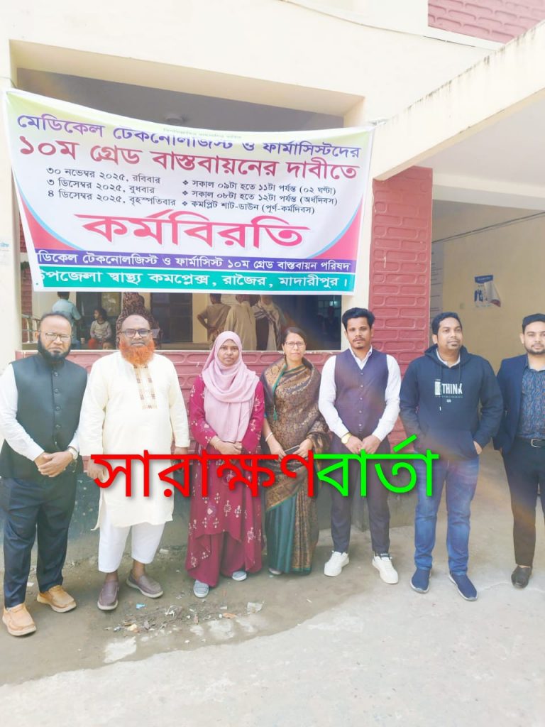 আজ ৩ডিসেম্বর ,২০২৫ বুধবার মাদারীপুরের রাজৈর উপজেলা স্বাস্থ্য কমপ্লেক্সে কর্মরত মেডিকেল টেকনোলজিস্ট ও ফার্মাসিস্টদের ১০ম গ্রেড বাস্তবায়নের দাবিতে রাজৈর উপজেলা স্বাস্থ্য কমপ্লেক্সের সামনে সকাল ৮:০০টা হতে ১২:০০টা পর্যন্ত ৪ ঘন্টা কর্মবিরতি পালন করছে।