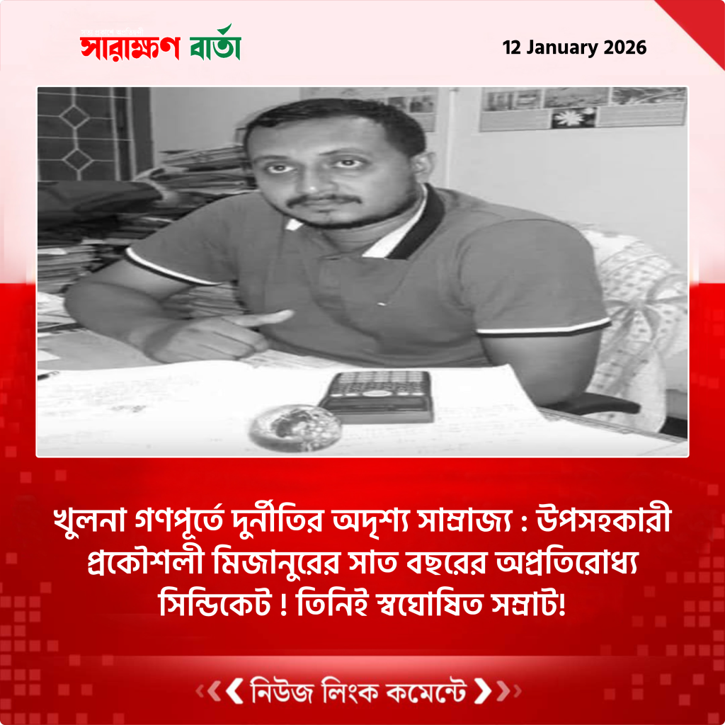 খুলনা গণপূর্তে দুর্নীতির অদৃশ্য সাম্রাজ্য : উপসহকারী প্রকৌশলী মিজানুরের সাত বছরের অপ্রতিরোধ্য সিন্ডিকেট ! তিনিই স্বঘোষিত সম্রাট!
