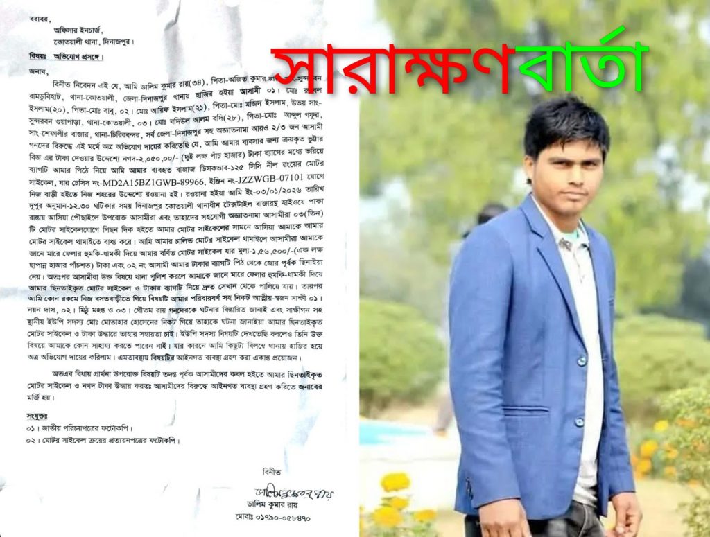 দিনাজপুর টেক্সটাইল বাজারস্থ হাইওয়েতে মোটর সাইকেল ও নগদ টাকা ছিনতাই ,অভিযুক্তদের নামে থানায় অভিযোগ।