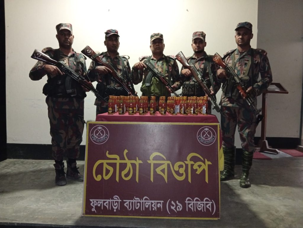 আসন্ন পবিত্র ঈদুল ফিতর উদযাপন উপলক্ষে ব্যাটালিয়ান ২৯ বিজিবি আওতায় সীমান্তবর্তী এলাকা হওয়ায় রাতভর ব্যাপক অভিযান পরিচালনা করে । ২০ মার্চ ২০২৬ তারিখ ফুলবাড়ী ব্যাটালিয়ন (২৯ বিজিবি) এর অধীনস্থ দাইনুর, খানপুর, রুদ্রানী ও চৌঠা বিওপি এবং কাটলা বিশেষ ক্যাম্প কর্তৃক পৃথক পৃথক স্থানে ০৫টি মাদক ও চোরাচালান প্রতিরোধ অভিযান পরিচালনা করে মালিকবিহীন অবস্থায় ৯৫৪০ পিস ভারতীয় নেশাজাতীয় ট্যাবলেট, ৪৬ বোতল বিদেশী মদ এবং ৩৮৪ বোতল বাংলাদেশী যৌন উত্তেজক সিরাপ আটক করতে সক্ষম হয়। আটককৃত মাদকদ্রব্য ও চোরাচালানী মালামালের সিজার মূল্য ৮,৮৯,৮০০/- (আট লক্ষ ঊননব্বই হাজার আটশত) টাকা।