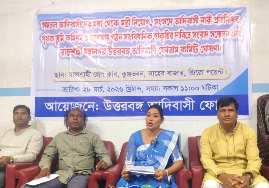 সমতল আদিবাসীদের পাঁচ দফা দাবিতে রাজশাহী প্রেসক্লাবে সংবাদ সম্মেলন।