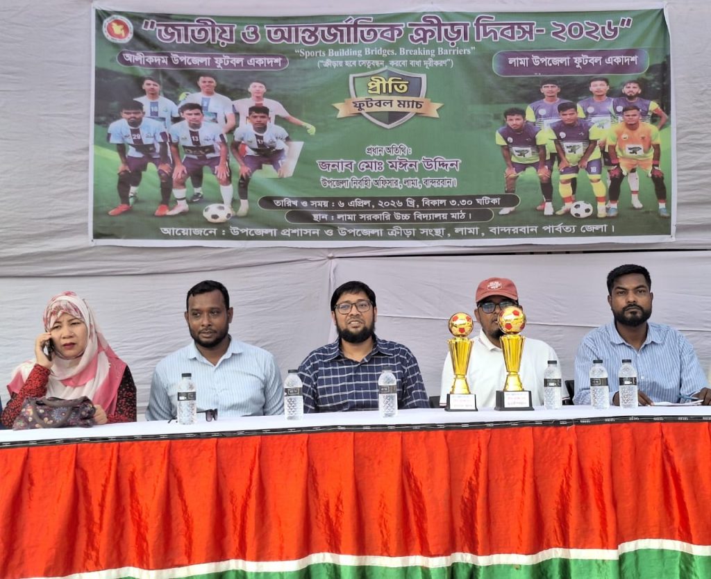 জাতীয় ও আন্তর্জাতিক ক্রীড়া দিবস ২০২৬ উপলক্ষে বান্দরবানের লামা উপজেলায় উপজেলা প্রশাসনের উদ্যোগে এক প্রীতি ফুটবল ম্যাচ অনুষ্ঠিত হয়েছে।