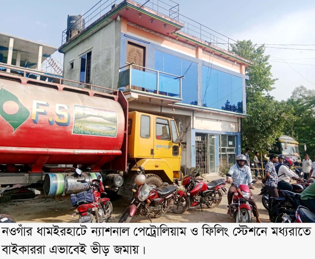 সারা দেশের ন্যায় নওগাঁর ধামইরহাটে দিন দিন জ্বালানি তেলের চাপ বেড়েই যাচ্ছে। তেল নিতে আসা মোটরসাইকেল চালকরা আগের দিন মধ্য রাত থেকে সড়কের ধারে জমান লম্বা সারি। ৫-৬ ঘন্টা অপেক্ষা করার পর চালকরা তাদের বাইকে পেট্রোল পেয়ে কষ্টের কথা ভুলে গিয়ে আনন্দে চলে যান নিজ গন্তব্যে। যানজট কমাতে ও শৃঙ্খলা রক্ষায় চালকদের ড্রাইভিং, রেজিষ্ট্রেশন সহ হিলমেট পরিচিতদেরই কেবল তেল প্রদান করা হচ্ছে। এদিকে জ্বালানি তেল যাতে পাচার করতে না পারে সে লক্ষ্যে সরকারি গোয়েন্দা সংস্থা এন.এস.আই, সরকারের দায়িত্বশীল গোয়েন্দা বাহিনী ধামইরহাটে বিভিন্ন স্থান গুলো নজরদারি অব্যাহত রেখেছে। পুলিশ প্রশাসন ও গোয়েন্দা সংস্থার যৌথভাবে মাঠ পর্যায়ে। বিশেষ করে সীমান্ত এলাকায় জ্বালানি তেল যেন কেউ অবৈধভাবে মজুদ ও পাচার না করতে পারে সে লক্ষে টহল জোরদার করা করা হয়েছে।