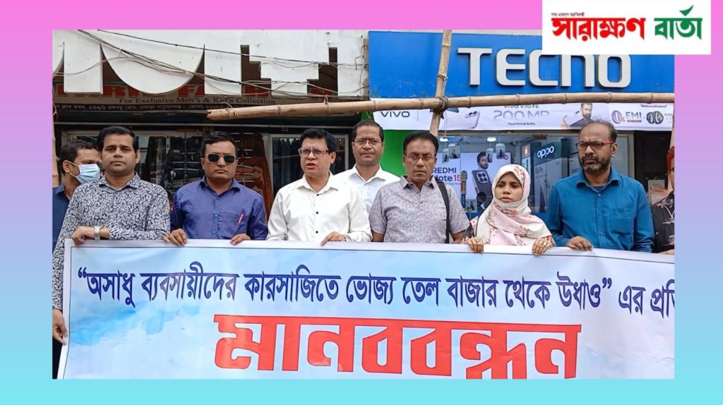 মানববন্ধনে বক্তারা বলেন, দেশে ভোজ্যতেলের বাজারে আবারও অস্থিরতা দেখা দিয়েছে। সরকার নির্ধারিত মূল্য উপেক্ষা করে সয়াবিন তেল প্রতি লিটারে ৩০ থেকে ৩৪ টাকা পর্যন্ত বেশি দামে বিক্রি করা হচ্ছে। কোথাও বোতলজাত তেলের কৃত্রিম সংকট তৈরি করা হচ্ছে, আবার কোথাও খোলা তেলের নামে অতিরিক্ত মূল্য আদায় করা হচ্ছে। এতে সাধারণ ভোক্তারা প্রতিনিয়ত প্রতারিত হচ্ছেন।