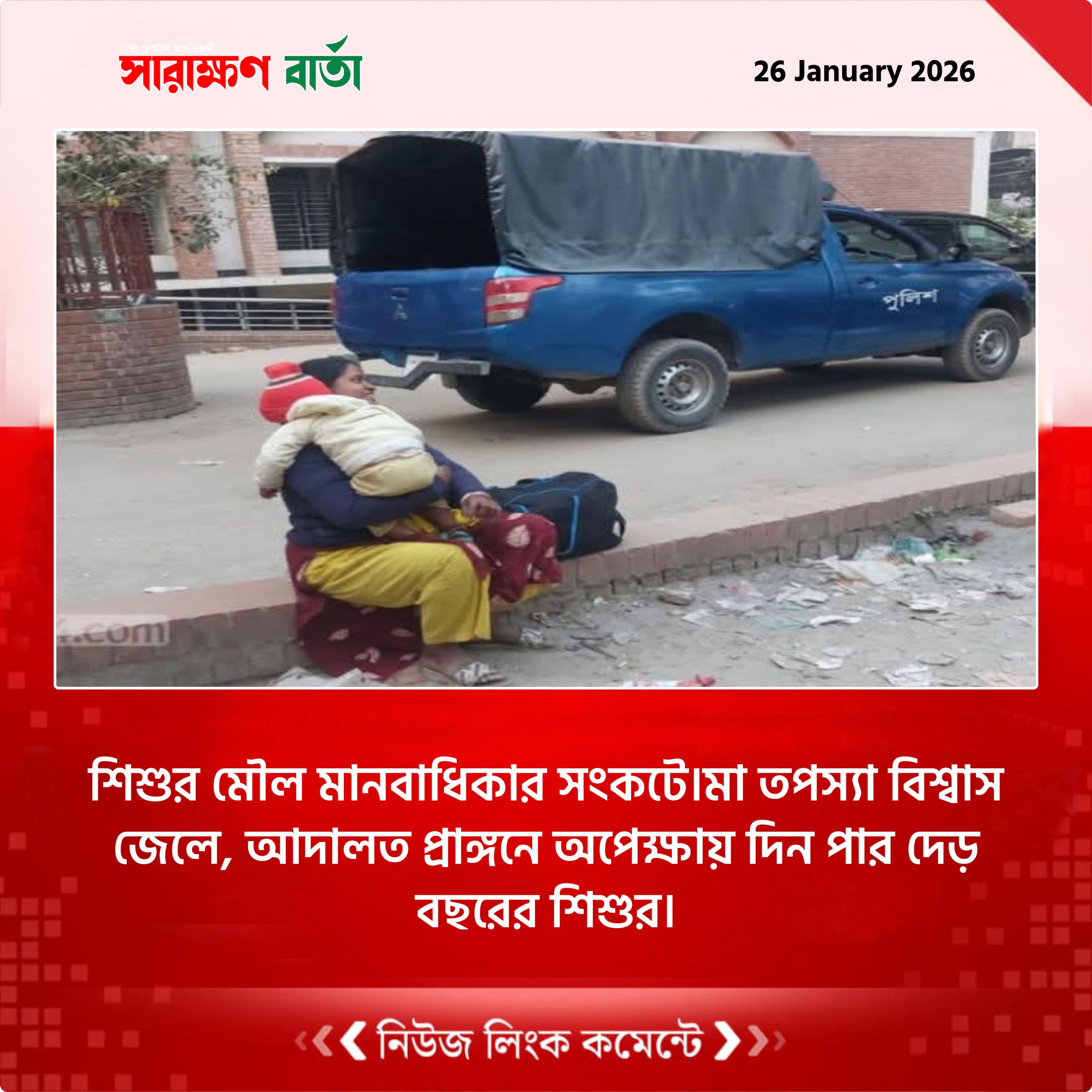 শিশুর মৌল মানবাধিকার সংকটে।মা তপস্যা বিশ্বাস জেলে, আদালত প্রাঙ্গনে অপেক্ষায় দিন পার দেড় বছরের শিশুর।