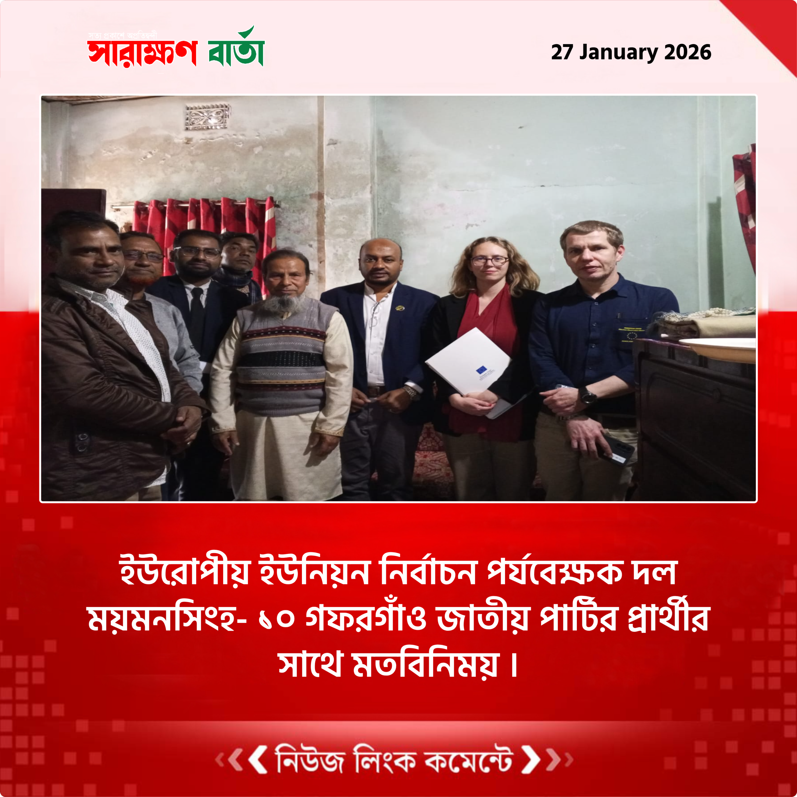 ইউরোপীয় ইউনিয়ন নির্বাচন পর্যবেক্ষণ মিশন বাংলাদেশ /২৬ এর প্রতিনিধি দলের দুজন সদস্য ময়মনসিংহ- ১০ গফরগাঁও আসনে বাংলাদেশ জাতীয় পার্টি মনোনীত