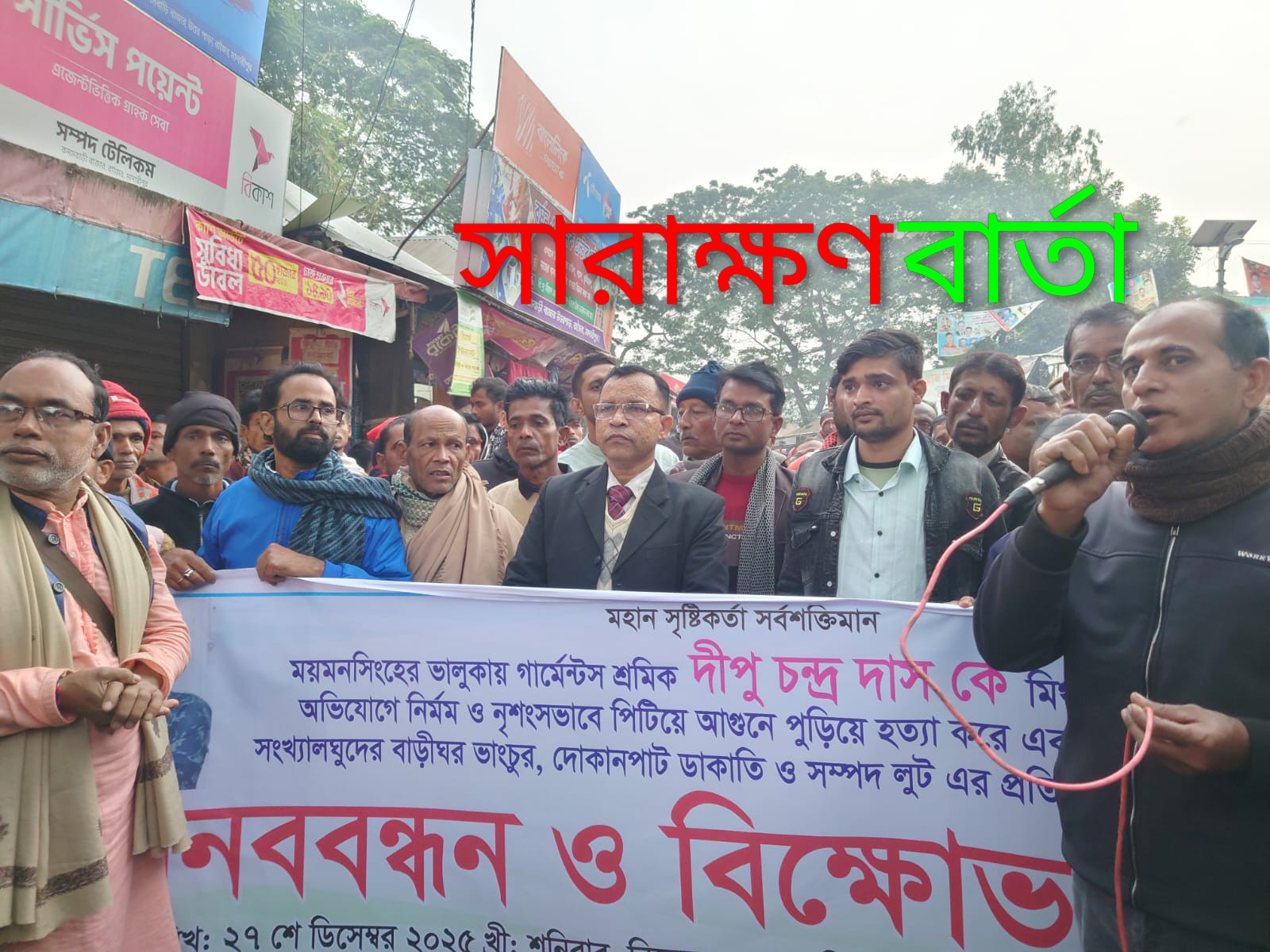 আজ শনিবার ( ২৭ ডিসেম্বর,২০২৫) তারি মাদারীপুর রাজৈরের কদমবাড়ীতে বিকাল ৪:০০টায় ময়মনসিংহ জেলার ভালুকায় নির্মমভাবে পিটিয়ে এবং জীবন্ত আগুনে পুড়িয়ে